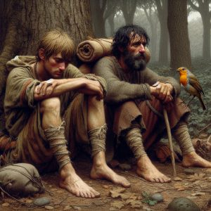 «… aún aturdidos por la visita, deciden descansar un momento antes de continuar viaje hacia Compostela. Eligen un remanso del bosque que se extiende a las afueras de la ciudad, camino de Galicia. Y se abandonan a la contemplación. Escuchan el canto armonioso de los pájaros. Del viento, meciendo las hojas de los robles, castaños, negrillos. Del agua que corre en un riachuelo cercano. Los blancos raitanes se acercan para comer de la palma de la mano del joven algunas migajas de pan. Como agradecimiento, las aves limpian con las suaves plumas del pecho los pies malheridos de su proveedor, tiñendo la blancura de sus pequeños cuerpos con el color intenso de la sangre del joven romero. Cuenta la tradición que, desde entonces, los raitanes muestran orgullosos su pecho rojo, símbolo de su encuentro con el hombre que fue capaz de amansar a las fieras.